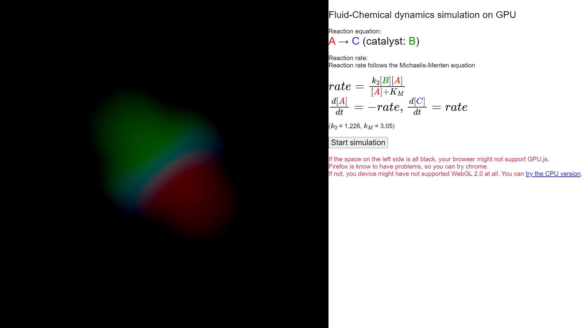 Around the same time or right before, I came across several fluid simulation videos on youtube. Then, I thought to myself, since chemical reaction - i.e. rate of change of concentration of the substances - in liquid and gas phases are dictated by the rate laws which I just learnt how to calculate, can I just combine fluid dynamics and chemistry to simulate the chemical reaction of liquids as they also move around in the space? Thus, the fluid chemical dynamics simulation project is born.
